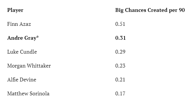 I’ve also been impressed by how Gray brought his teammates into play. Last season he created seven big chances for Al-Riyadh, which equated to 0.31 big chances created per 90. That’s a strong figure, topped only by Azaz across Argyle’s ranks last term.