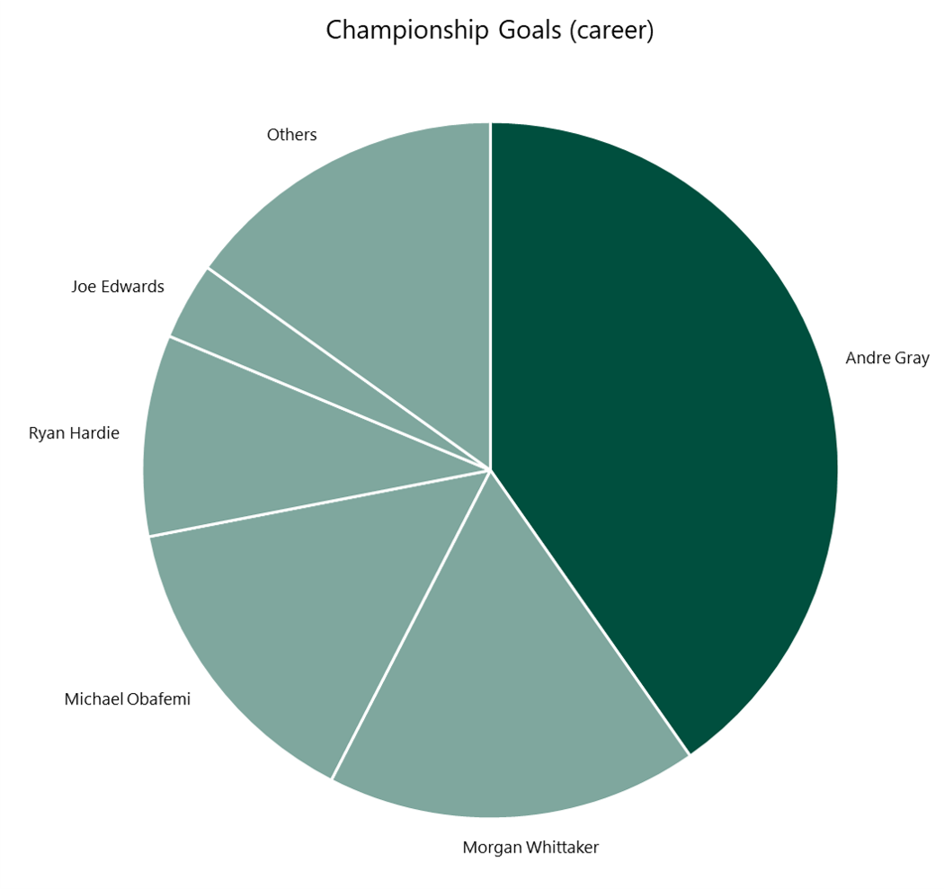 Ultimately, Gray has scored 56 Championship goals across the course of his career. That’s far more than anyone else in Argyle’s squad – it’s not too far away from being as many as the rest of the squad put together. You may remember in our analysis of Michael Obafemi I presented a chart displaying the Championship goals scored by Argyle players across their careers. Here’s the updated version, with Gray wiping the floor with the competition.