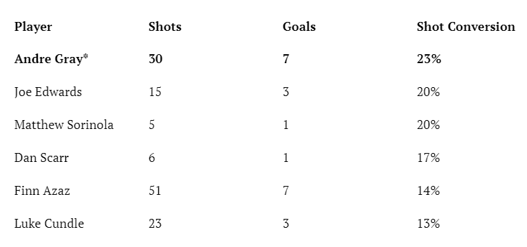 Gray’s tally of 10 goal contributions is solid enough, and was beaten last season at Argyle only by the familiar trio of Morgan Whittaker, Ryan Hardie and Finn Azaz. That consisted of seven goals and three assists, and those goals came at a highly impressive shot conversion rate of 23%. That would be enough to top Argyle’s charts from last season. Sure, against defenders in the Saudi Pro League he may have had more time to place those shots, but it demonstrates how clinical Gray can still be in front of goal.